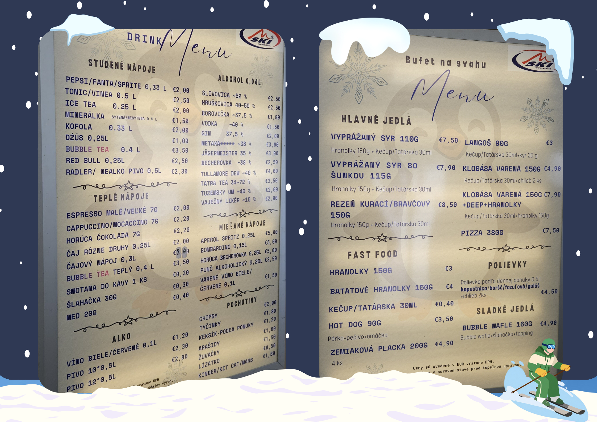 Počas lyžovačky sa zastavte v našom bufete priamo na svahu M-ski. Ponúkame teplé jedlá, horúce nápoje aj rýchle občerstvenie, ktoré vás zahreje a dodá energiu na ďalšie jazdy. Príjemné posedenie a rýchla obsluha sú samozrejmosťou.